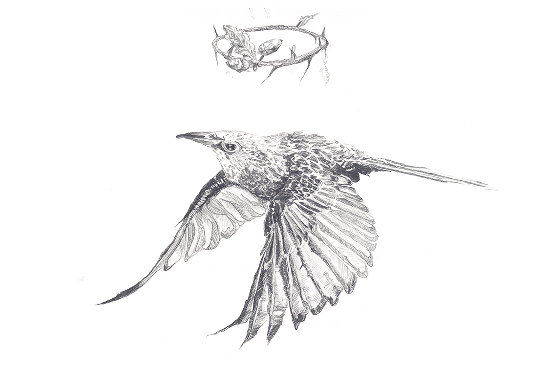 Boy Dancer is a new exhibition emerging from the first collaboration between poet Annemarie Ní Churreáin and visual artist Niamh McCann. A Solstice-commissioned project, Boy Dancer interweaves a series of poems by Ní Churreáin with line drawings and installation by McCann, exploring grief, ritual, and transformation. Boy Dancer unfolds as a textual wake—an act of keeping vigil, remembering, and celebrating in response to the loss of Ní Churreáin’s foster brother. Her poetry practice, often concerned with cultures of silence and care in Ireland, is deeply rooted by her interests in place, native language, and folklore. McCann’s visual response embraces the lyrical and mythical qualities of the poems, drawing on imagery of birds and beasts as seers, omens, and witnesses—resounding McCann’s allegorical and personal collaborative practice.